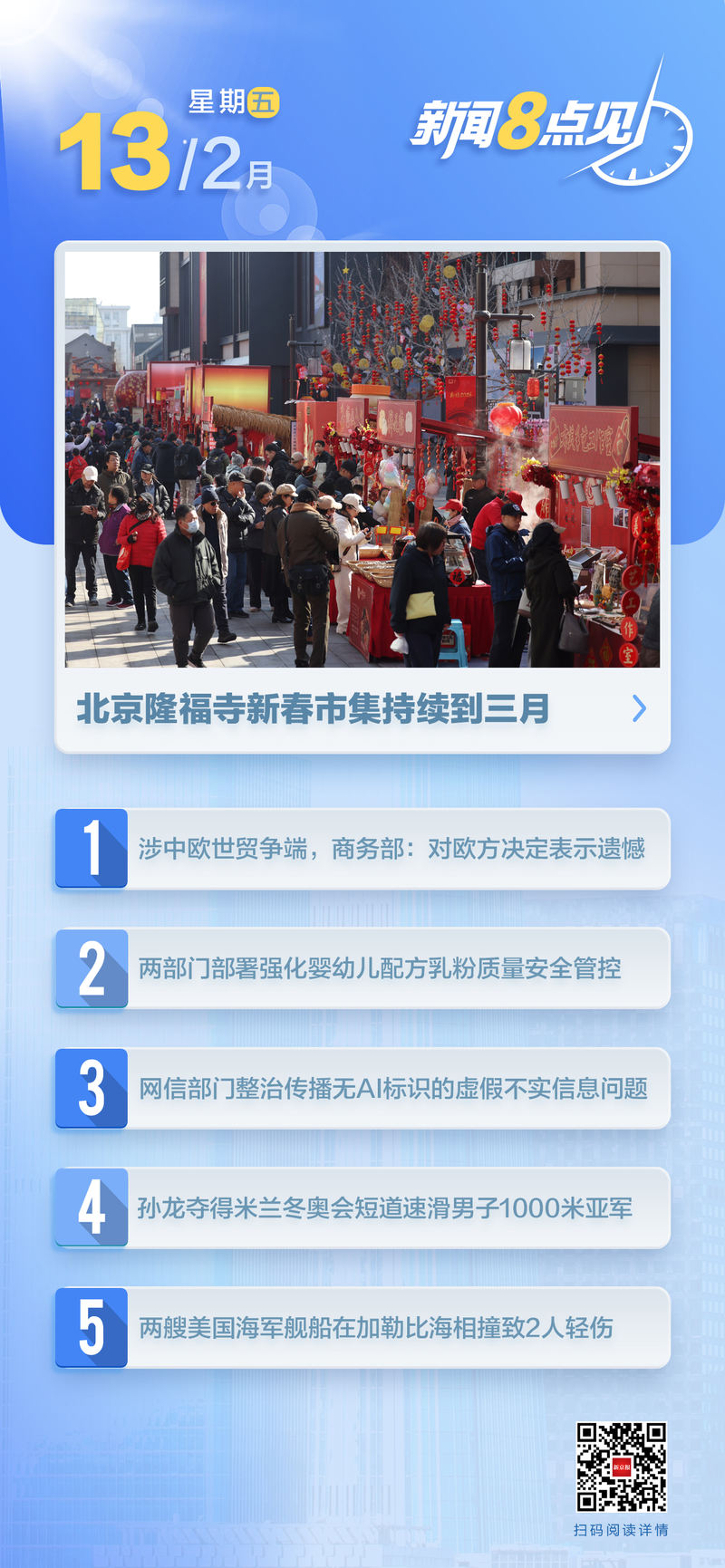 【时政】党中央办公厅印发《党委(党组)对下级党组织主要领导人员进行监督咨询的办法》 近日,党中央办公厅印发《党委(党组)对下级党组织“高级领导人员”进行监督咨询的办法”,并下发通知,要求各地区、各部门认真贯彻执行。并实施它们。 (新华社)阅读全文>>>国务院食品安全办公室、国家市场监督管理总局已部署到各地加强婴幼儿配方奶粉质量安全管理。继近期雀巢婴儿配方奶粉因检出蜡样芽孢杆菌呕吐毒素发生预防性召回事件后,国务院食品安全局、国家市场监督管理总局已对雀巢婴儿配方奶粉进行预防性召回。对此高度重视,并要求雀巢(中国)有限公司完成对在中国大陆销售的部分批次产品的召回。截至目前,我国尚未发现因摄入婴儿配方奶粉导致蜡状芽孢杆菌感染呕吐毒素中毒的确诊病例。市场监管总局已扩大到各地加强婴幼儿配方奶粉质量安全监管,督促各生产企业进行蜡样芽胞杆菌DON检测,严格原材料和产品出厂前检验,全力确保婴幼儿配方奶粉质量安全。网信办(市场监管总局)对未采用人工智能识别的虚假信息传播问题进行了纠正和严格处理。近期,部分网络账号在发布人工智能合成信息时未添加人工智能识别。存在使用虚假或误导性内容的问题不得误导、误导公众,破坏网络生态系统,造成负面影响。网信部门要求网站平台开展彻查整治,依法依约删除账号13421个,删除违法信息54.3万余条。 (央视新闻)阅读全文>>>商务部:中美通过经贸磋商机制保持各层级密切沟通。商务部2月12日举行例行新闻发布会,发言人何亚东表示,中美关系。经贸团队通过经贸磋商机制和两国领导人在釜山达成的协议细节,保持各层级密切沟通。他表示,两国正在就实施协议及时交换意见。介绍吉隆坡经贸磋商成果及解决彼此经贸关切。中方愿本着平等、尊重、互利的态度,相向而行,按照两国领导人会晤和此前通话达成的共识,加强对话沟通,妥善管控分歧,拓展务实合作,与美方一道,推动中美两国健康稳定可持续发展。关系经济和商业目的。 (新华社)阅读全文>>>商务部已应欧盟要求世贸组织设立中欧世贸组织争端专家组。商务部条法司相关负责人表示,中方一贯高度重视知识产权保护,多次强调将严格保护知识产权。遵守世贸组织规则和入世承诺,不断完善知识产权保护立法和执法。我们取得的成果是有目共睹的。中方对欧盟的决定表示遗憾。针对欧盟有关要求,中方将根据世贸组织争端解决程序作出适当回应,坚决维护自身合法权益。 (商务部)全文>>>商务部发言人否认进口欧盟乳制品 在回答记者有关调查最终判决的问题时,商务部新闻发言人表示,判决报告显示,欧盟进口乳制品存在补贴,对我国相关产业造成重大损害,且补贴与重大损害之间存在因果关系。商务部于2026年2月12日作出最终公告,裁定:欧盟企业税率将在7.4%至11.7%之间,并决定自2026年2月13日起实施补偿措施,为期5年。(商务部)阅读全文>>>国家市场监管总局召开餐饮连锁企业管理入职会。 2月11日,国家市场监管总局在京召开餐饮连锁企业行政指导会议,督促企业严格落实主体责任,采取切实有效措施,保障消费者食品安全。 (国家市场监督管理总局)阅读全文>>> 【本地】隆福寺年货市场将持续至3月。街区入口处的“Ryofukuma”雕塑。新京报记者 王贵斌 摄 2月12日,记者再次走访隆福寺周边地区发现,这里的年味更浓、人气更旺,一些老字号都成为流行的年货。龙福寺年货市场的一大亮点是30多个知名品牌齐聚一堂,陪伴市民欢度新年。作为东城新年消费版图上极具特色的一环,热闹非凡的龙福庙会据悉将持续至3月3日。(新京报)阅读全文 >>> 前门大街亮灯,营造浓浓的年味氛围 2月12日,前门大街将张灯结彩,营造浓浓的年味。图>>>北京20万一线交通工作者春节期间上班,线上交通平台降价。记者从北京市交通委获悉,为确保春节期间首都交通安全有序,预计将有20万名公交车、卡车、出租车、网约车司机、地铁工作人员、送货司机等交通工作者北京一线服务将继续走在交通服务、物资保障、城市服务的前列。记者了解到,一些在线交通平台正在降低费率,以帮助司机增加收入。邮政、快递企业严格保障员工休息休假权利,根据员工工作量和个人意愿实行错峰休假,按时足额支付加班工资。 (北京报)阅读全文>>> 【社会】湖南某公司强茶营销模式是否存在传销?官方通知:调查已经开始。 2月12日,湖南省益阳市安化县人民政府发布情况通报。近日,有媒体发表相关报道,称“爱迪尔卡莱莎的Koicha营销模式包含传销”,引起社会关注。安化县人民政府重视高度重视,严格遵循法律法规原则,实事求是,开展调查核实工作。安化县前期成立专门联合工作组,开展调查工作。目前,涉事企业已被责令停止调查期间的团队娱乐、会议和培训活动。相关情况正在进一步调查中,调查结果将及时公布。 (安化县人民政府)阅读全文>>> 【财经】国家电子电影管理局联合商务部组织开展“电影+”消费综合试点。根据各省及相关城市的评选报告,北京市朝阳区、吉林省长春市、上海市虹口区、江苏省无锡市、浙江省宁波市福建省福州市、山东省青岛市、河南省郑州市、湖北省宜昌市、湖南省长沙市、广东省深圳市、四川省重庆市两江新区。成都、陕西、江苏昆山、浙江湖州南浔等16个城市成为电影+消费综合试点城市