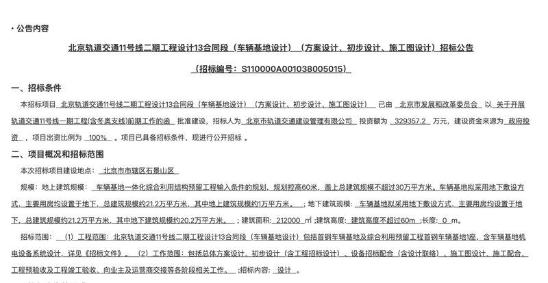 新京报讯(记者裴剑飞)作为北京轨道交通三期建设规划的主干线路,11号线二期工程备受关注。继去年发布第一次和第二次环境评估后,该生产线最近取得了进一步进展。据北京公共资源交易服务平台信息显示,11号线二期工程设计合同第13标段(即线路车辆段)已对概要设计、初步设计和施工方案设计进行招标。近日,北京铁路11号线二期车辆段设计招标工作启动。图/北京公共资源交易服务平台 石景山、丰台等地区居民对Lineea 11二期建设充满期待。尤其是近期地铁1号线巴东线西段4个车站因施工停运n 石景山地区不少居民呼吁加快11号线二期建设,缓解现有线路压力,为公众提供更多出行选择。 2025年5月,11号线二期规划布局及第一次环评公布。 2025年7月,发布第二次环境影响评价。根据相关规定,11号线二期工程通过两次环评后即可正式开工建设。但此后,11号线二期工程建设并未有新的进展公布,这让一些市民对线路建设进度感到担忧。 11号线二期为西向线路,连接首钢、北京西站、丽泽商务区等重要功能区,为沿线居民区提供便捷出行。第二次环境影响评价资料据了解,11号线二期工程起于西侧一期终点的新首钢站(不含),止于东侧日泽商圈站。全长约18.4公里,共设车站14座,其中换乘站5座。它还将连接到北京西站。根据公开信息,二期工程建设工期为四年,最终开工日期以相关部门公告为准。北京轨道交通11号线二期规划方案示意图 图/北京投资公司官网 2021年底至2023年底,11号线一期工程4个车站将依次开通。目前的服务范围是从木门口站到新宿港站。从这些车站可换乘地铁6号线和S1金安桥站。 11号线二期工程将取代现有的11号线二期工程,是一期工程的东延伸,途经石景山、丰台、海淀、西城四个区。该项目的建设将改善沿线地区的出行条件,提供高速、大运力的公共交通服务。根据招标公告,11号线车辆段二期工程将选址石景山区。储罐规划高度60米,总建设规模约21.2万平方米,投资额约32.9亿元。车辆库拟建在地下。所有主要建筑均位于地下。总建筑面积约21.2万平方米,其中地上约1万平方米,地下约20.2万平方米。 1号线二期工程1号线服务于新首港高端产业综合服务区、鹿谷、青塔住宅小区、北京西站中心及马区。联岛住宅群、丽泽金融商务区、丽泽城市码头交通枢纽等区域。该仓库位于信首港南部高端产业综合服务区,占地面积约33.8公顷。 11号线二期工程14个季节均为地铁站。从西向东依次为锅炉厂南路、衙门口西、体育场南街、衙门东、鹿谷街、吴家村、小花坳、青塔、万丰路、莲花桥、北京西站、马连路、丽泽商圈。其中5个车站为换乘站:体育场南街、衙门口东、莲花桥、北京西站、丽泽商圈。小花洋站规划为远期换乘站。 S具体可在体育场南街站换乘正在建设中的地铁1号线支线。在野文口东站换乘市郊铁路都志福中央线。在莲花桥站换乘地铁10号线。在北京西站换乘地铁7号线、9号线。丽泽商务区站是11号线、14号线、16号线、利津线、大兴机场线等5条线路的换乘站。编辑 张蕾 遮瑕 刘宝庆