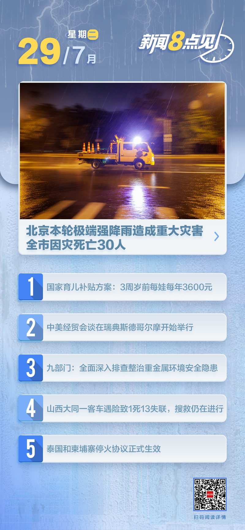[跟随北京的大雨]北京的这种强烈降雨造成了巨大的灾难。北部的山区遭受了严重的损失。在28次的24:00,从这次强烈的雨季开始,北京的平均降水量为165.9毫米,最大降雨在Lang Hwanyu和Miyun的Zujiayu中达到543.4毫米。最大的降水强度发生在Huairou的Dongyu,其降水量为95.3毫米,发生在26到23:00到22:00。极端雨继续造成了巨大的灾难。由于灾难,有30人在北京丧生。其中包括28个七月和扬金的两个。受影响地区的31条道路已损坏,没有修理16条线,包括Xingyang和Xihuo Road Line。该电源在136个村庄中断了,在通信中心总共损坏了62条光电缆,并卸下了1,825个基站。 (CCTV新闻)阅读全文>>>国家enound管理总部已启动对北京,天津和赫比的第三层洪水预防的紧急响应。根据“国家紧急洪水管理和干旱缓解的国家计划”以及相关法规,国家洪水管理总部已决定于7月28日对北京,蒂安吉和赫比的第三层洪水进行紧急响应。最近,北京,米云,华尤和其他地方的大雨以及赫比省的Zhangjiakou造成了严重的洪水和灾难。 7月28日,全国灾难预防委员会减少和帮助,在北京和河北的全国各地第四级灾难的紧急响应,将一群人派遣的团体派往灾难地区,以验证现场灾难情况,LeadinG并帮助地方政府在灾难援助活动中做得很好,例如对受影响者的基本救济。根据当地救灾活动的需求,紧急管理部紧急管理部以及国家食品和材料准备办公室将基于早期分配灾难灾害的中心材料的早期分配,包括折叠式灾难帮助材料,包括折叠床,毛巾,毛毯,紧急照明等材料,包括灾难材料等,包括折叠材料等,包括折叠材料等,包括折叠式材料,以及折叠式杂物,折叠式杂物,折叠式材料,折叠式材料,包括折叠式材料,折叠式杂物,折叠, NAC材料和43,000。分配了疾病,例如折叠床,毛巾,毯子,紧急照明等。毯子,紧急照明和2,000套家庭紧急资金与中国红十字会合作iation。通过保证紧急材料社会合作和政府的机制,通过阿里巴巴集团,一个基金会,艾登基金会,贝特舞基金会,汉洪基金会等,以支持紧急食品,饮用水,妇女,妇女,儿童用品,儿童供应,卫生包,卫生包,卫生包和其他每日基本要素,用于灾难的地区,改善紧急迁移和谋杀率的生活和有用的救援人员的生活和有用的生活。 (应急管理部)北京开始对预防城市中的第一级洪水的紧急响应,即8:00 pm 28。除非您需要它,否则不出现,请不要于7月28日离开。北京的洪水管理司令部提醒公众,提醒公众密切关注预警预测和安全委员会,并要求所有单元对所有响应进行响应的响应,以做出相关的响应。第一层预防洪水的紧急响应将发出直到上升为止n。除了保证为人员,公司和机构提供城市运营和生活服务外,除非有必要,否则不需要员工工作。除非您需要它,否则请勿离开。那些真正需要旅行的人应该注意旅行提醒。如果有洪水淹没的区域,请勿在水下开车,也不要去低地域停车车或区域。 (CCTV新闻)阅读完整的故事>>>北京Huairou区被转移到来自15个村庄和街道上113个村庄的10,464人,恢复了10,464人。 (北京新闻)阅读全文>>>水资源部改善了IV水平的紧急响应,以防御III级北京和河北的洪水。根据“水资源部预防水和终结的紧急响应法规”,水资源部在7月28日晚上9:00 PM改善了IV级的IV级紧急响应。北京将于今年发起首次对大雨的红色警告。公民将在必要时不会出来[当前发行]国家的儿童保育补贴计划将宣布!在三年之前,孩子每年将为3600元。 7月28日,宣布了国家儿童保育系统的实施计划。从2025年的Eneror,无论他的第二个或第三个孩子如何,他每年都将获得3600元的补贴,直到三岁。 (新华社新闻社)阅读全文>>>详细信息:六C和国家繁殖补贴计划的Sive Sive Sive中国的经济和商业辩论始于瑞典的斯德哥尔摩。 7月28日,当地时间,中国以及美国的经济和商业团队在瑞典的斯德哥尔摩进行了中国和美国的经济和商业对话。 (新华社新闻社)在2025年6月,调查并解决了八次国家监管侵犯行为的27,977例。 7月28日,中央蟒蛇纪律检查和国家监督委员会发表了一份关于国家研究的摘要,并于2025年6月解决了全国八个中央法规的精神。这是连续第142个月发布的每月报告数据。 (中央学科检查委员会和国家监督委员会的网站)阅读全文>>>国家洪水管制委员会已发起了4级的紧急回应,以防止洪水和预防在上海,江苏和Zhijiang的台风。由于7月28日至31日的台风,在上海,江苏和Z江省的某些地区大雨将很高,而在某些地区将看到大雨。根据“国家紧急洪水管理和浮雕的国家计划”以及相关法规,国家洪水管理总部已决定在下午4:00向洪水管理和防止台风发起紧急响应。 7月28日。(CCTV新闻)阅读全文>>>>生态和环境和九个部门:综合且详细的措施,介绍了7月28日举行的常规新闻发布会中引入的重金属的环境安全风险,以及对环境安全环境安全的全面且详细的研究。会议。 (CCTV新闻)阅读全文>>> [社交]在上海大都会的一辆公共汽车处于危险之中,留下13人没有接触。搜救和救援正在7月27日左右5:00左右在Yaipanzhuang镇,Guqianbao,Tianzen县,天顿市和Shanxi省。福特Quanes的乘客巴士开车时处于危险之中。 7月28日,来自北京的一名新闻记者从28个大约28岁的天岑县政府得知救援行动仍在进行中,发现了13人失踪人员。 (北京新闻)阅读全文>>> [金融]中国新中国Chantan Motorcycle Group Co.,Ltd。New Central Automotive Company Changan Art Ville Group Co.,Ltd。即将建立。 Ltd.即将建立新车。 New Automotive State Enterprise