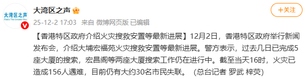 据大湾区之声报道,12月2日,香港特区政府举行记者会,介绍大埔旺富法院火灾搜救及安置工作最新进展。据警方介绍,连日来已完成对五栋建筑的搜查,还有望昌阁等两栋建筑仍在搜查中。下午 4 点开始同一天,火灾死亡人数上升至156人,仍有约30名公民失踪。 (记者罗吴子英)编辑李伊林子